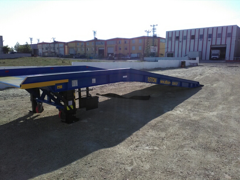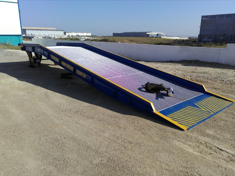 Mobile portable ramp on the front of the rotary wheel fitted with two pieces of rubber has been in the airwhile the wheels during loading, the load is the jack feet touch the ground. Mobile ramp after the end ofthe installation process, krikonun double leg lifted upwards, the ground rubber tires will be downloaded and sent to the ramp is moved to the ground.